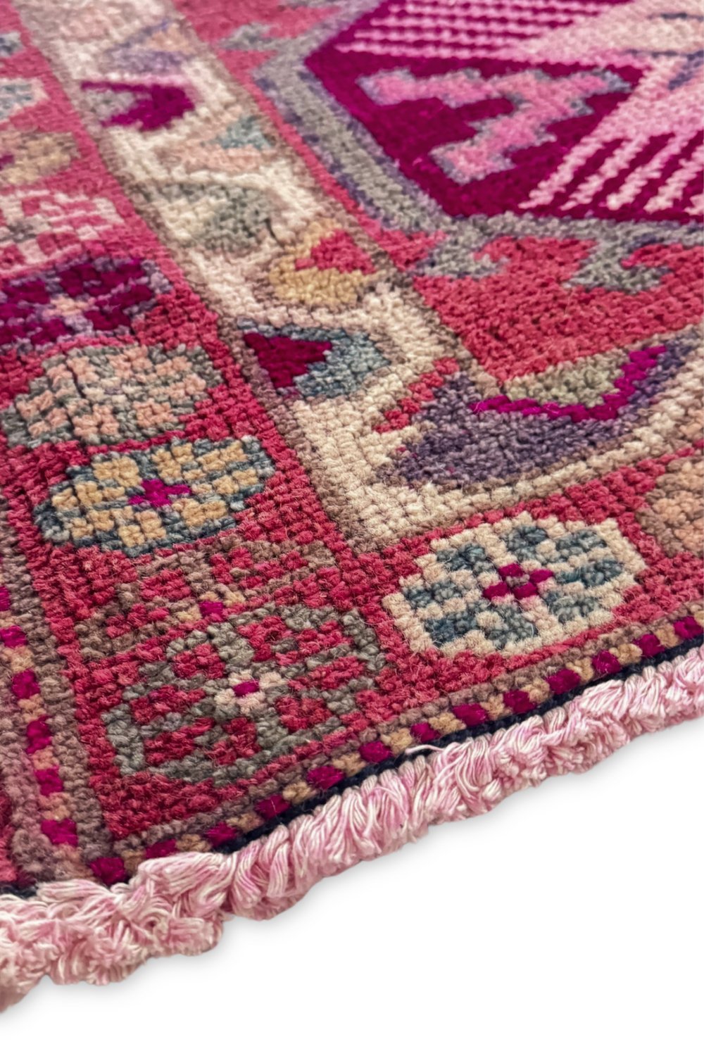 With dimensional shades of red and vivid pops of pink, this beautiful handwoven, vintage runner is a unique piece of art. Its long length and tiny details within the pattern are what make this piece extra special.