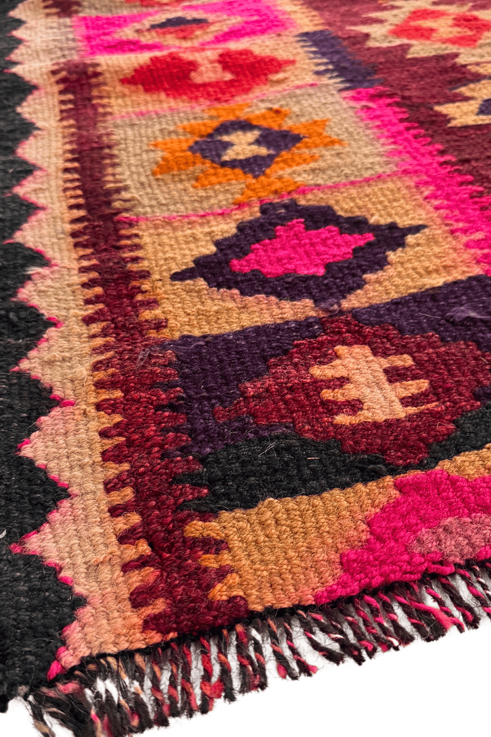 This vintage Kilim rug was handwoven in a fun colorful pattern. A versatile sized rug that could suit any room in your home, it lends a feminine yet classic aesthetic with its warm foundation and vivid accents.