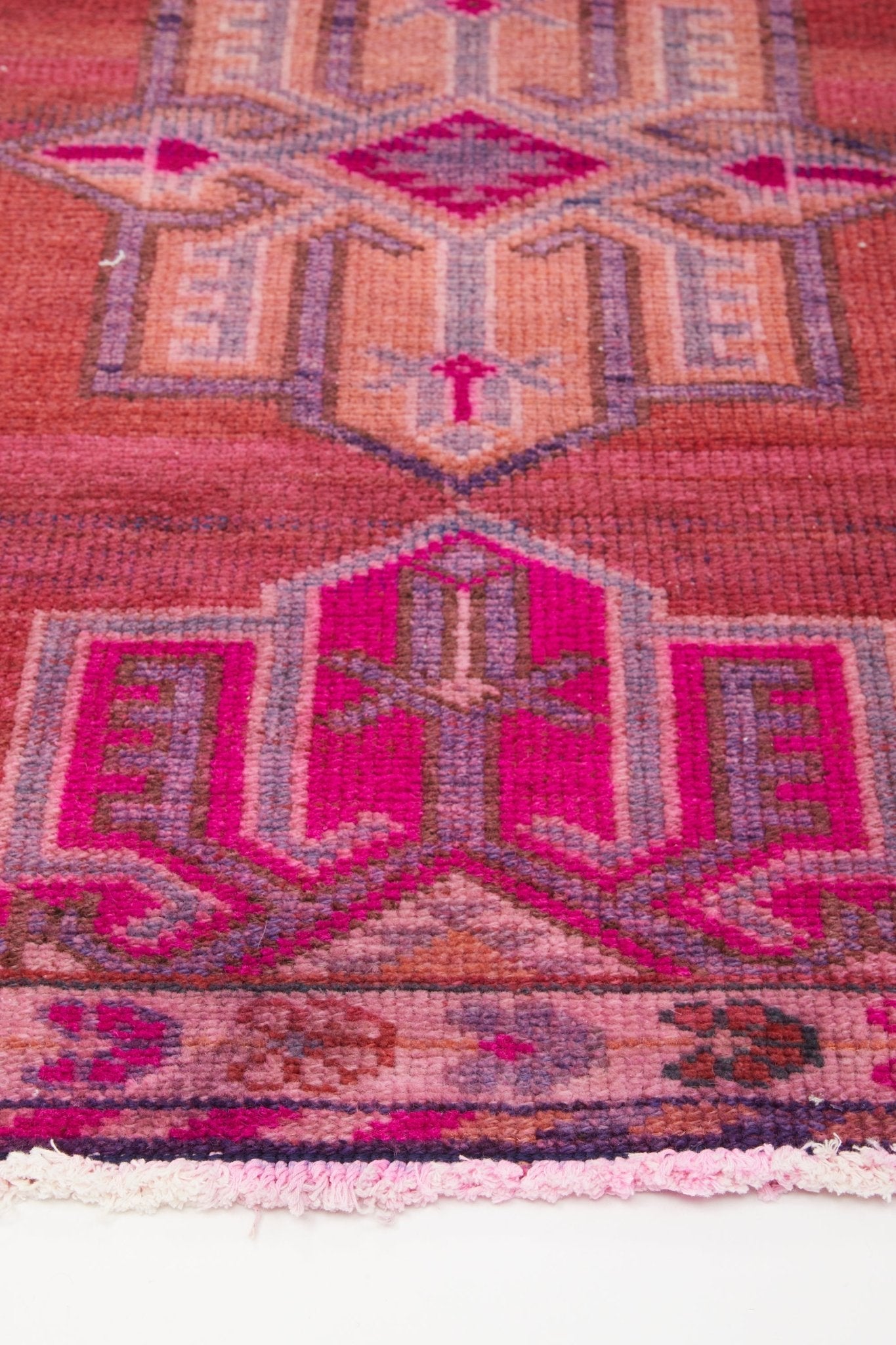 The 'Vivian' vintage Turkish runner rug is a handwoven work of art for your floors. The large-scale pattern is bold and the fun vibrant colors will add a pop of character to any space. It’s just the perfect size for a hallway or entryway, and also adds a delightful pop of color to a kitchen.