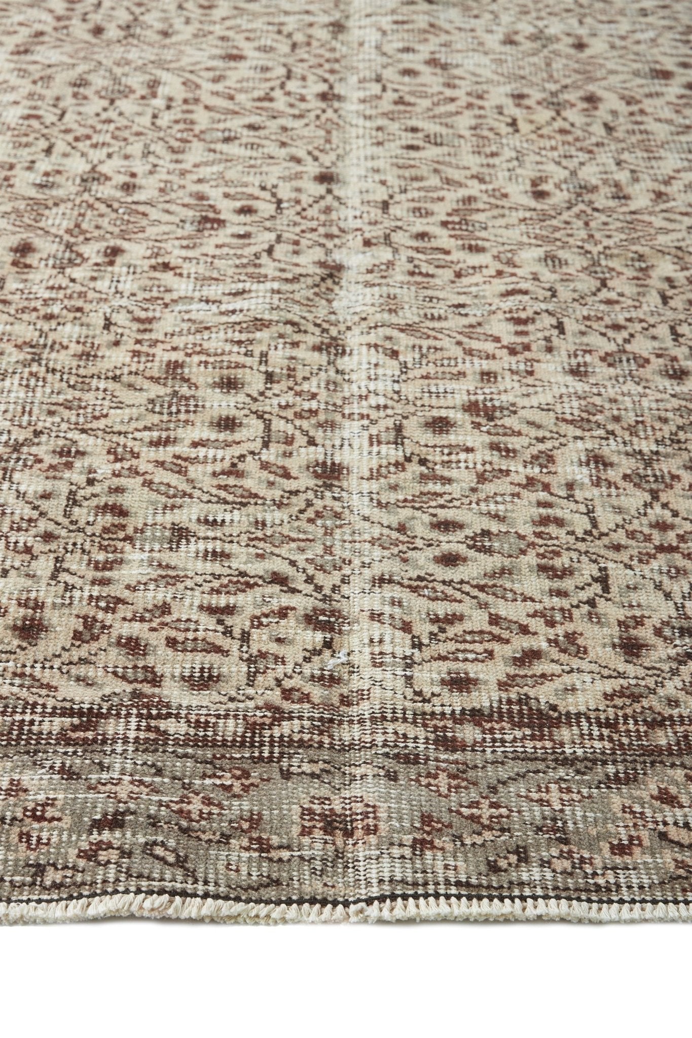 The 'Acacia' vintage Turkish rug is a well-worn rug that has a neutral base that would compliment just about any space. It has a distinct design and is one of a kind.