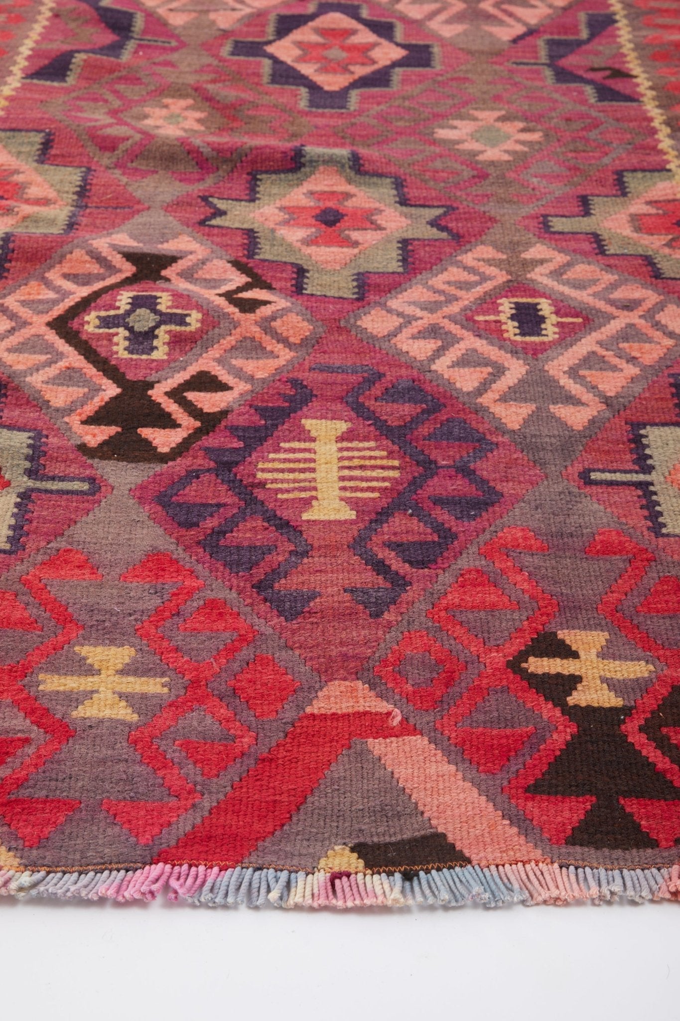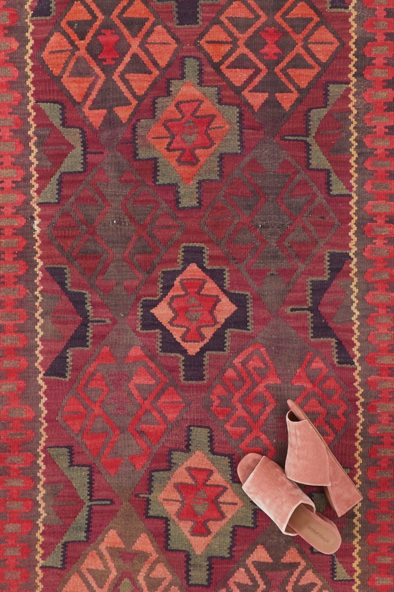 With its intricate weavings and beautiful combination of hues, 'Adeline' transforms a space. The maroon and peach diamond pattern catches the eye from across the room. The pattern tells a story that a weaver crafted by hand many years ago.
