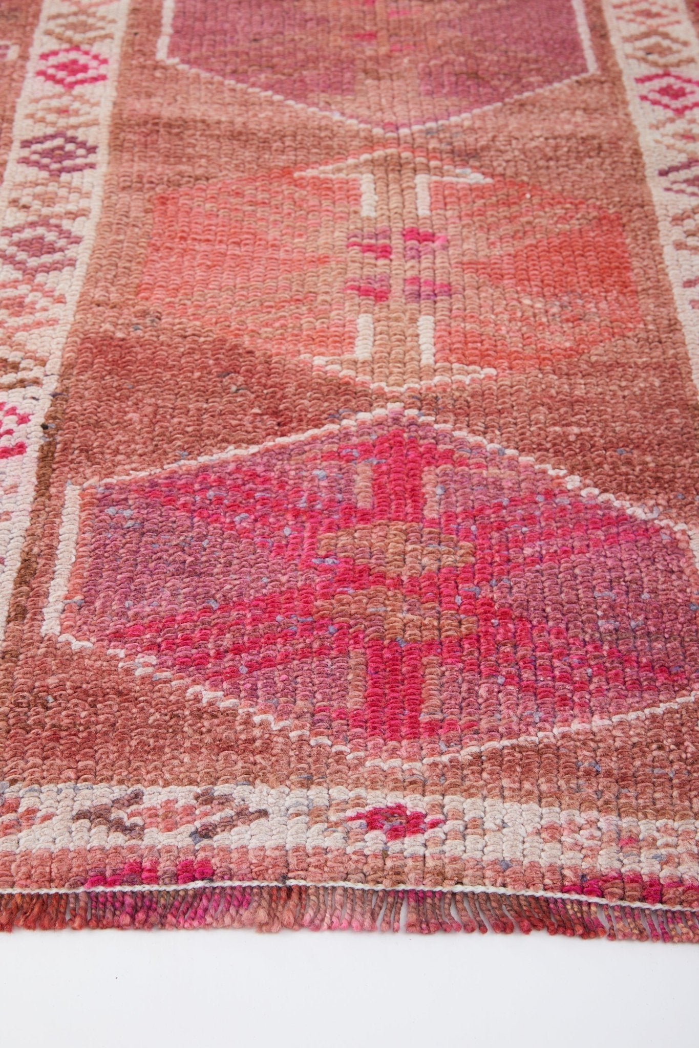 The 'Agnes' vintage Turkish rug transforms a space with its intricate pattern in varying shades of pink, blush, purple and mauve. The intricate pattern tells a story that a weaver crafted by hand many years ago. It is just the right size for a hallway or entryway, and also adds a delightful pop of color to a kitchen.