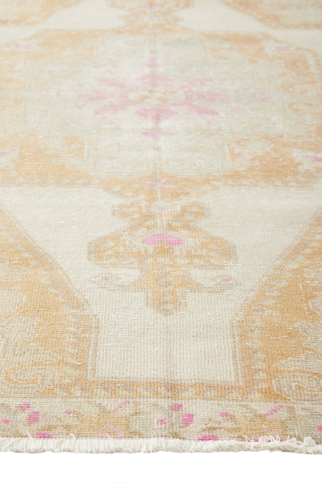 The 'Moonlight' vintage Turkish rug was handwoven in a dainty color way and pattern. A versatile sized rug that could suit any room in your home, it lends a feminine yet classic aesthetic. It has a distinct design and is one of a kind.