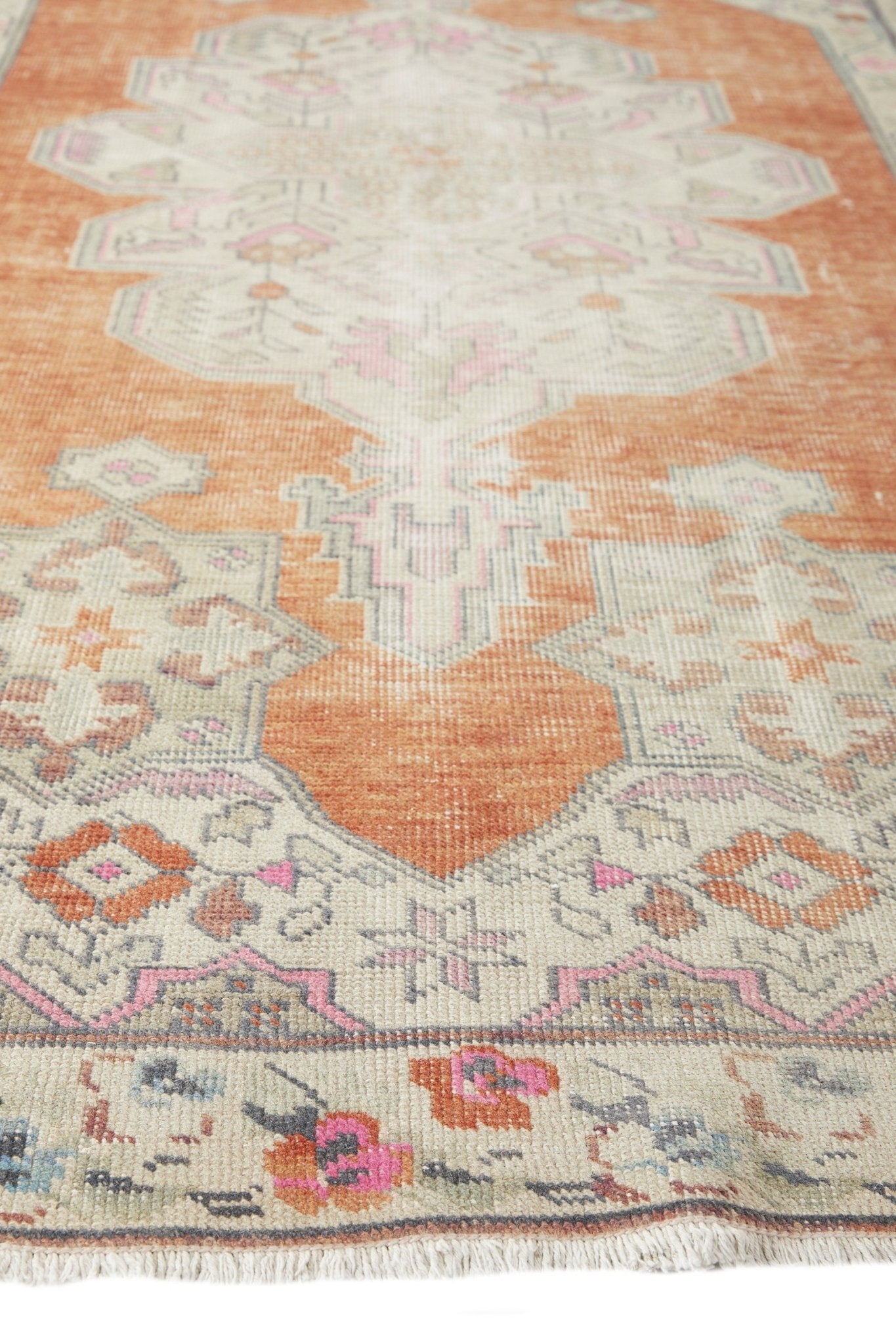 With a whimsical pattern, perfect patina and soft hues, this beautiful, handwoven vintage rug is a unique piece of art for your floors. The size is perfect for just about any space in your home and would look great in an entryway or bedroom. It has a distinct design and is one of a kind.