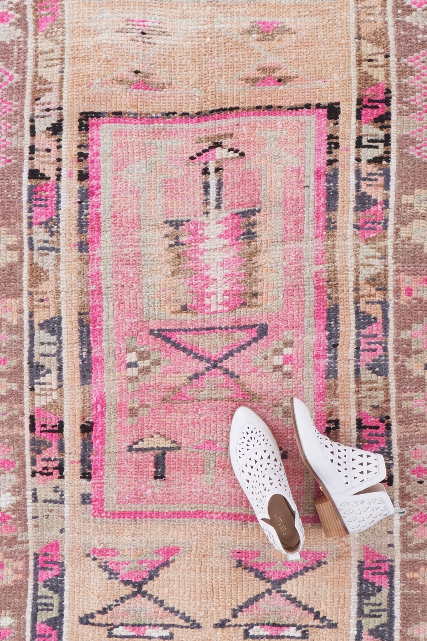 The 'Bea' vintage Turkish rug is a dimensional work of art for your floors. The whimsical hues and one-of-a-kind geometric pattern will make this piece a conversation starter for your home.