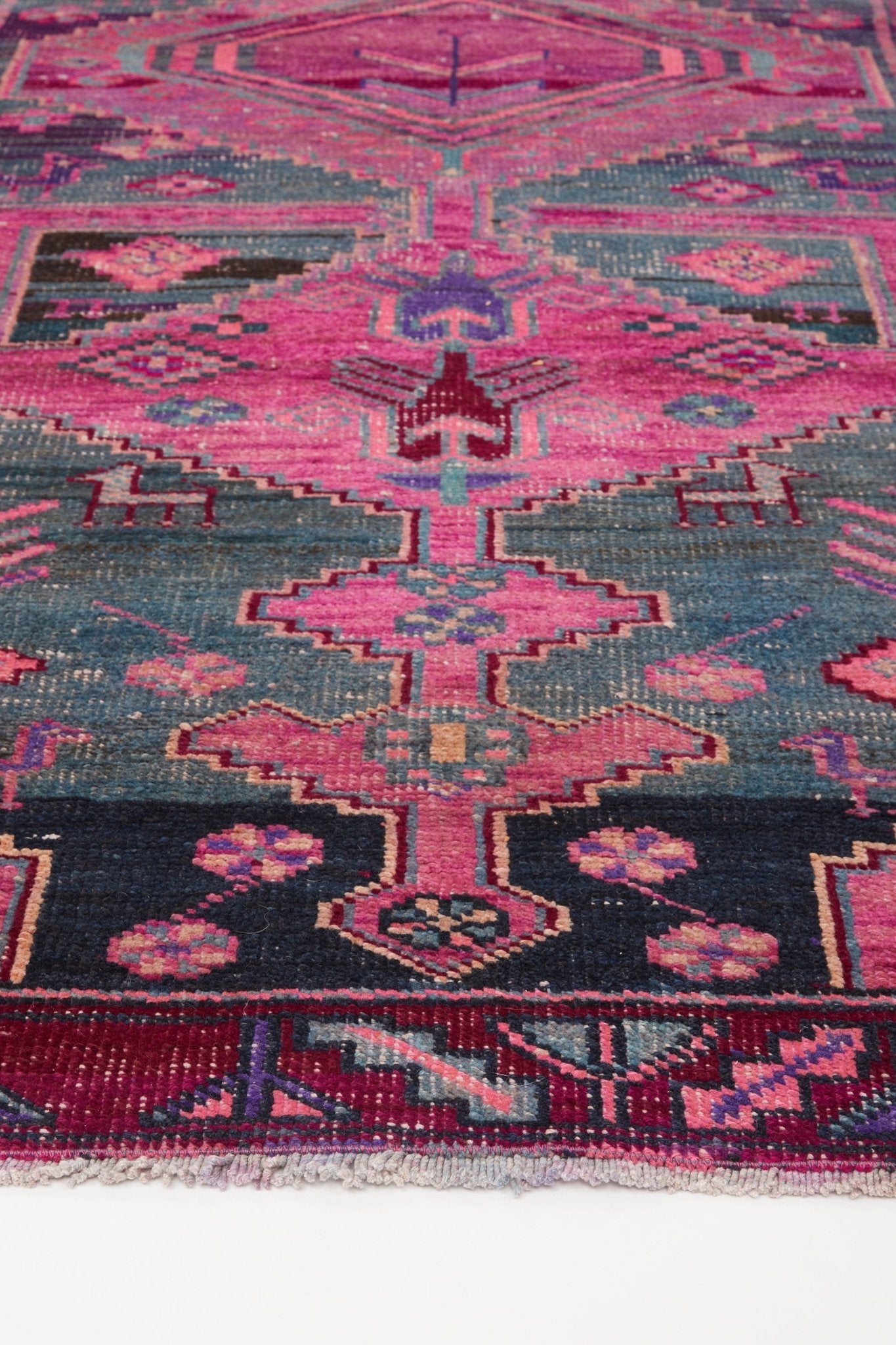 The 'Birdie' vintage Turkish runner rug is an exceptional, handwoven, piece of art for your floors. With dimensional shades of purple, pink, blue and teal this vintage runner can transform any space and is just the right size for an entryway, hallway, and can add a delightful pop of color to a kitchen.