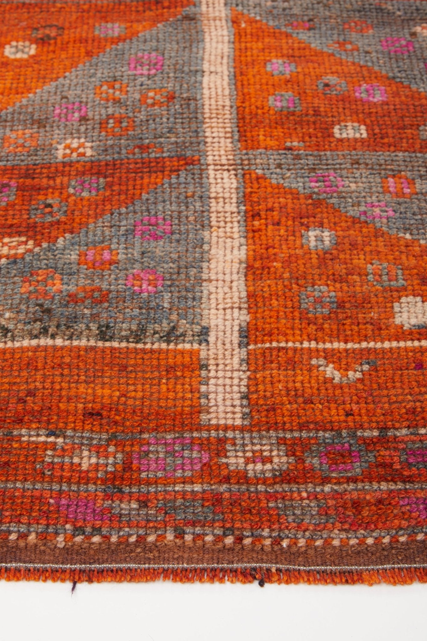 With dimensional shades of orange and blue hues, this beautiful, handwoven, vintage runner is a piece of art. The rare, intricate pattern tells a story that a weaver crafted by hand many years ago. 'Calvin' can transform any space and is just the right size for a hallway or entryway, and also adds a delightful pop of color to a kitchen.