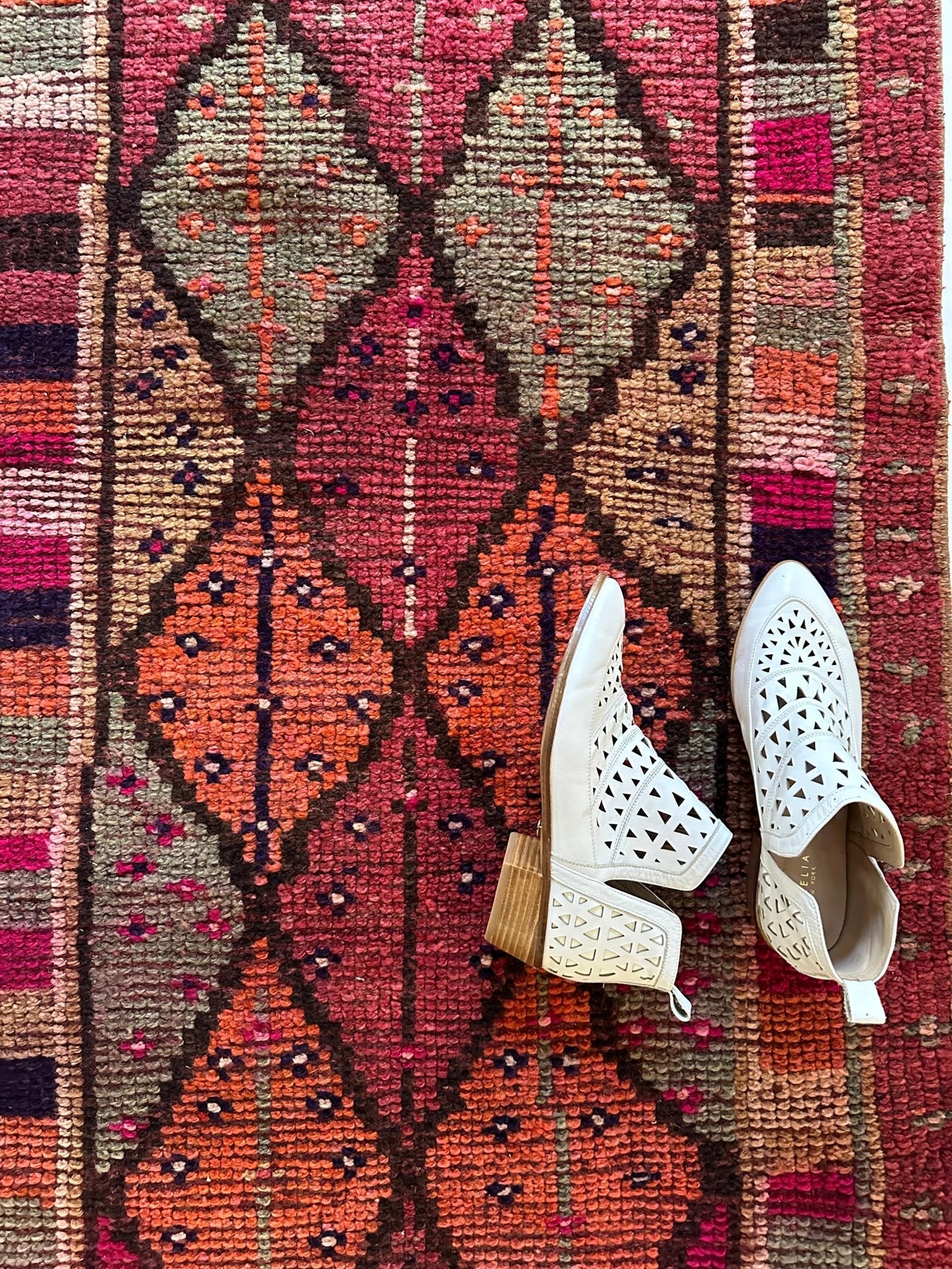 The 'Cera' vintage Turkish runner rug transforms any space with its colorful, diamond pattern in varying shades of pink, orange, purple, and neutral tones. It's just the right size for a hallway or entryway, and also adds a delightful pop of color to a kitchen.