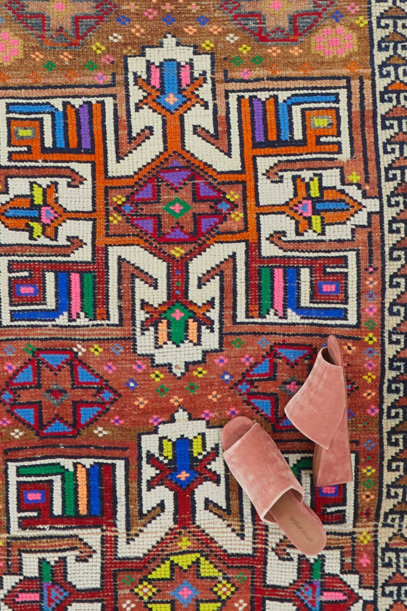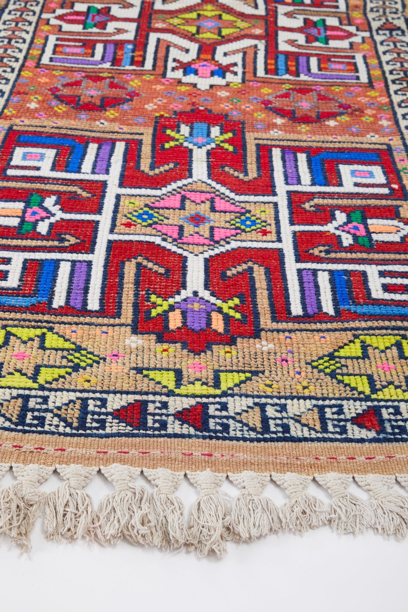 The 'Ginger' vintage Turkish rug is a vibrant work of art for your floors. The vivid colors and bold pattern will make this piece a conversation starter for your home.