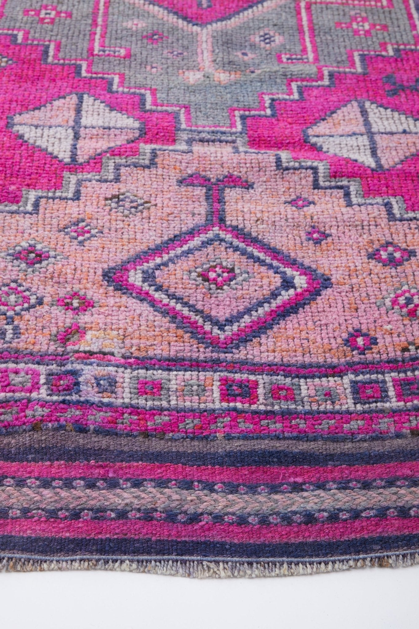 With its intricate pattern in bold fushia, this vintage runner transforms a space. The intricate pattern tells a story that a weaver crafted by hand many years ago. It’s just the right size for a hallway or entryway, and also adds a delightful pop of color to a kitchen.