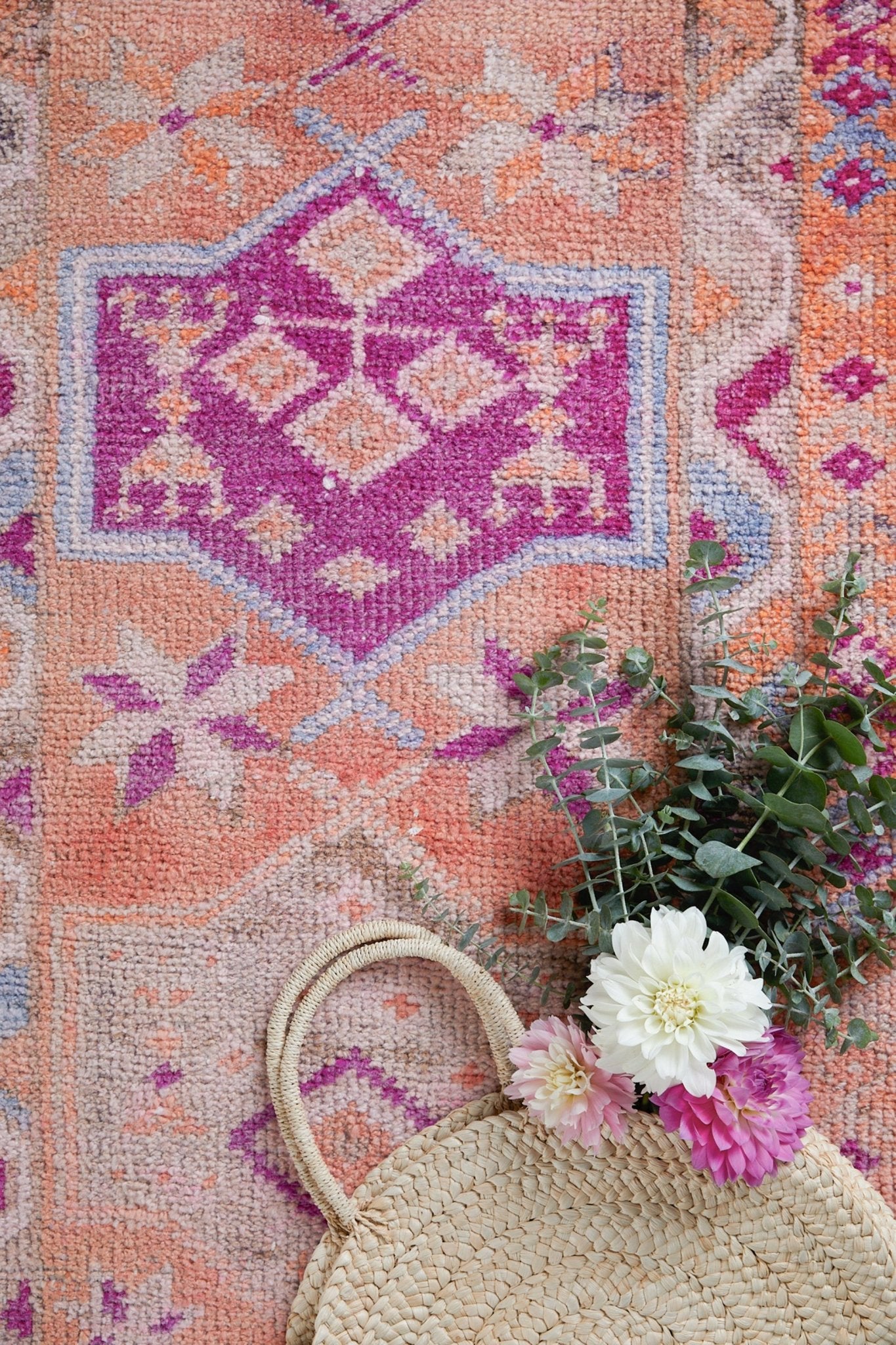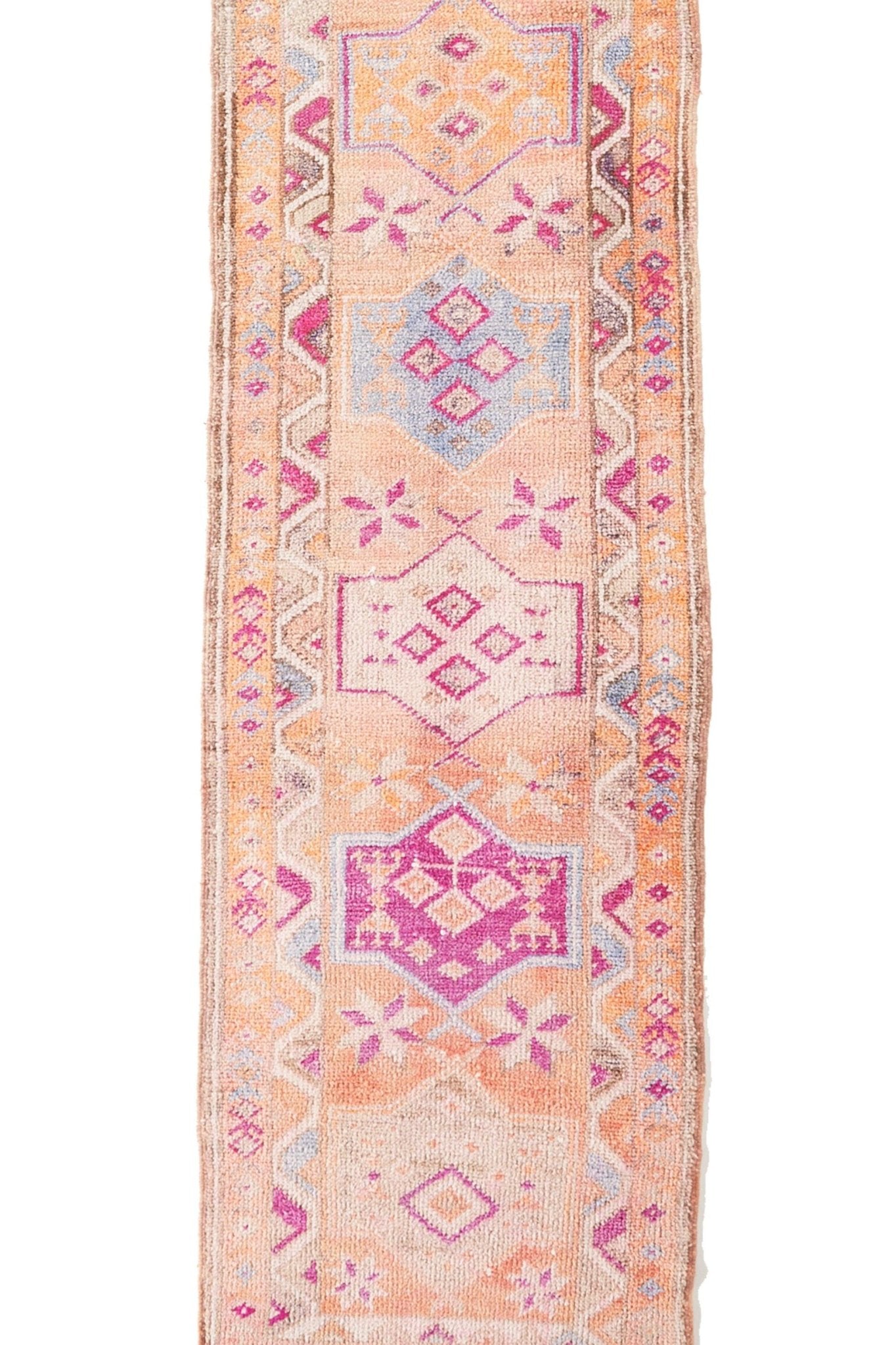 The 'Kismet' vintage Turkish runner is a stunning bold rug for your home. The playful peach and pink hues are sure to make this rug a conversation starter.