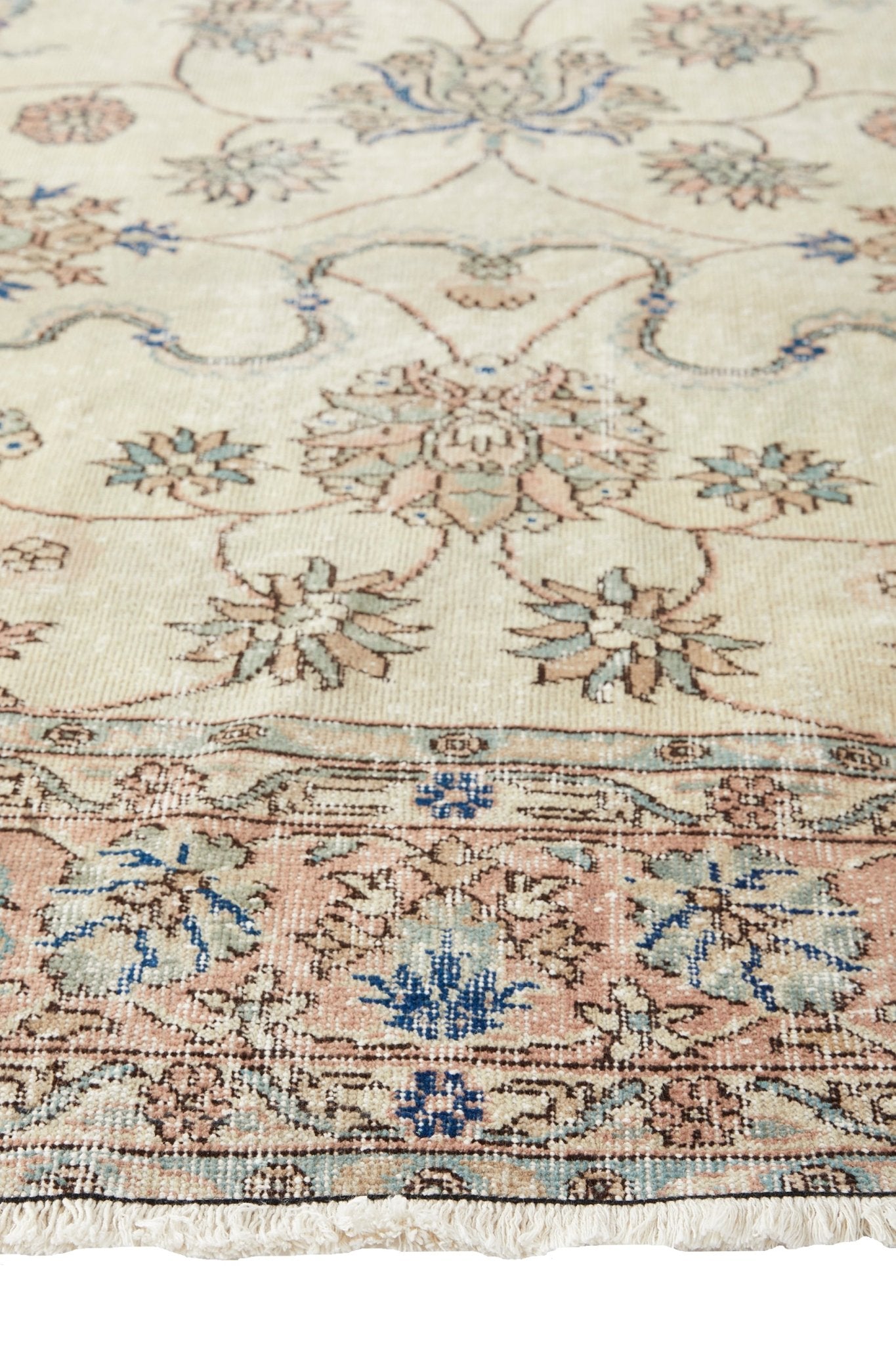 This beautiful worn rug has an intricate floral pattern that makes a statement. The neutral hues with hints of faded blue will complement any style. The size is perfect for just about any space in your home and would look great in a living room or bedroom.
