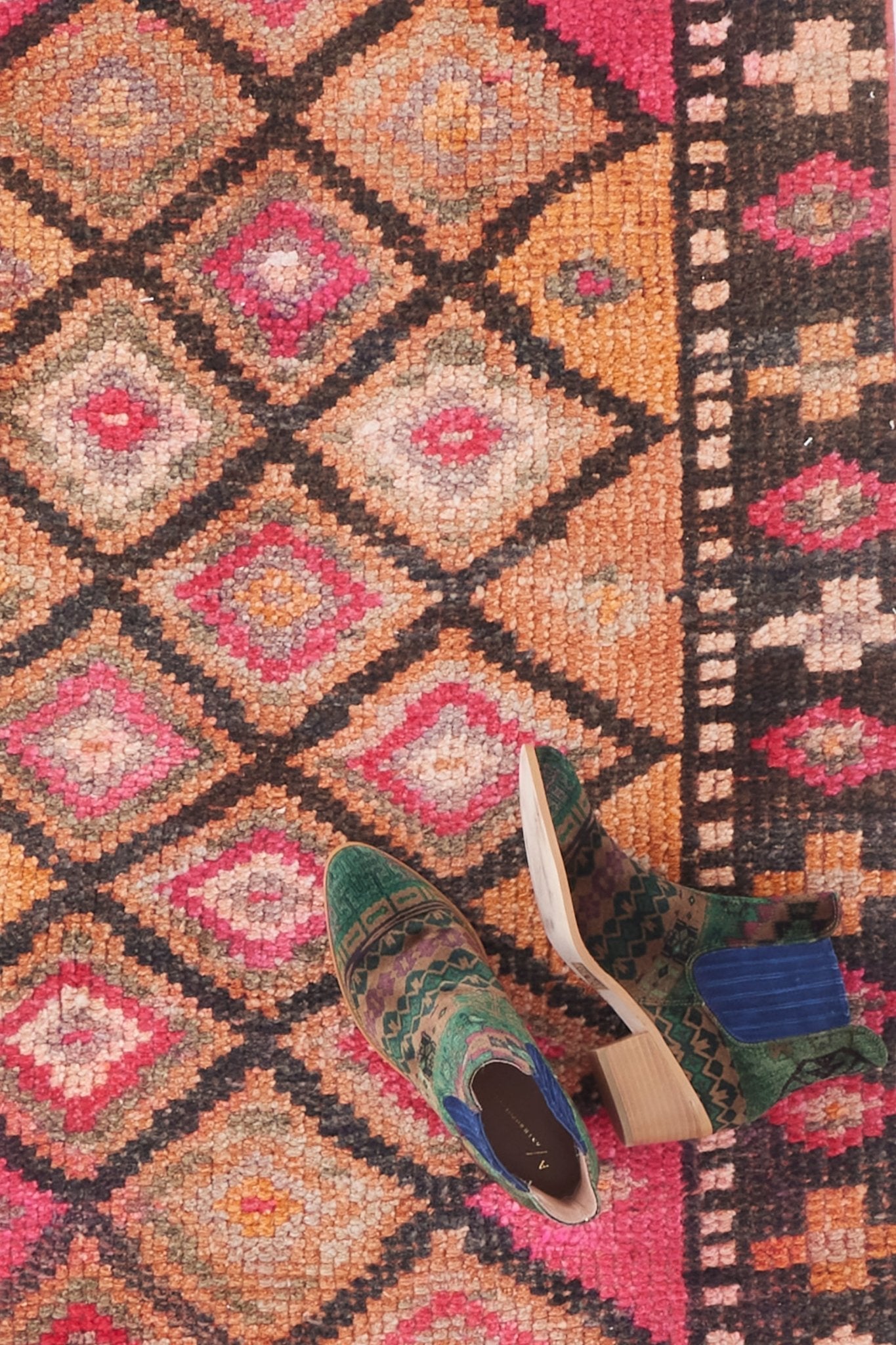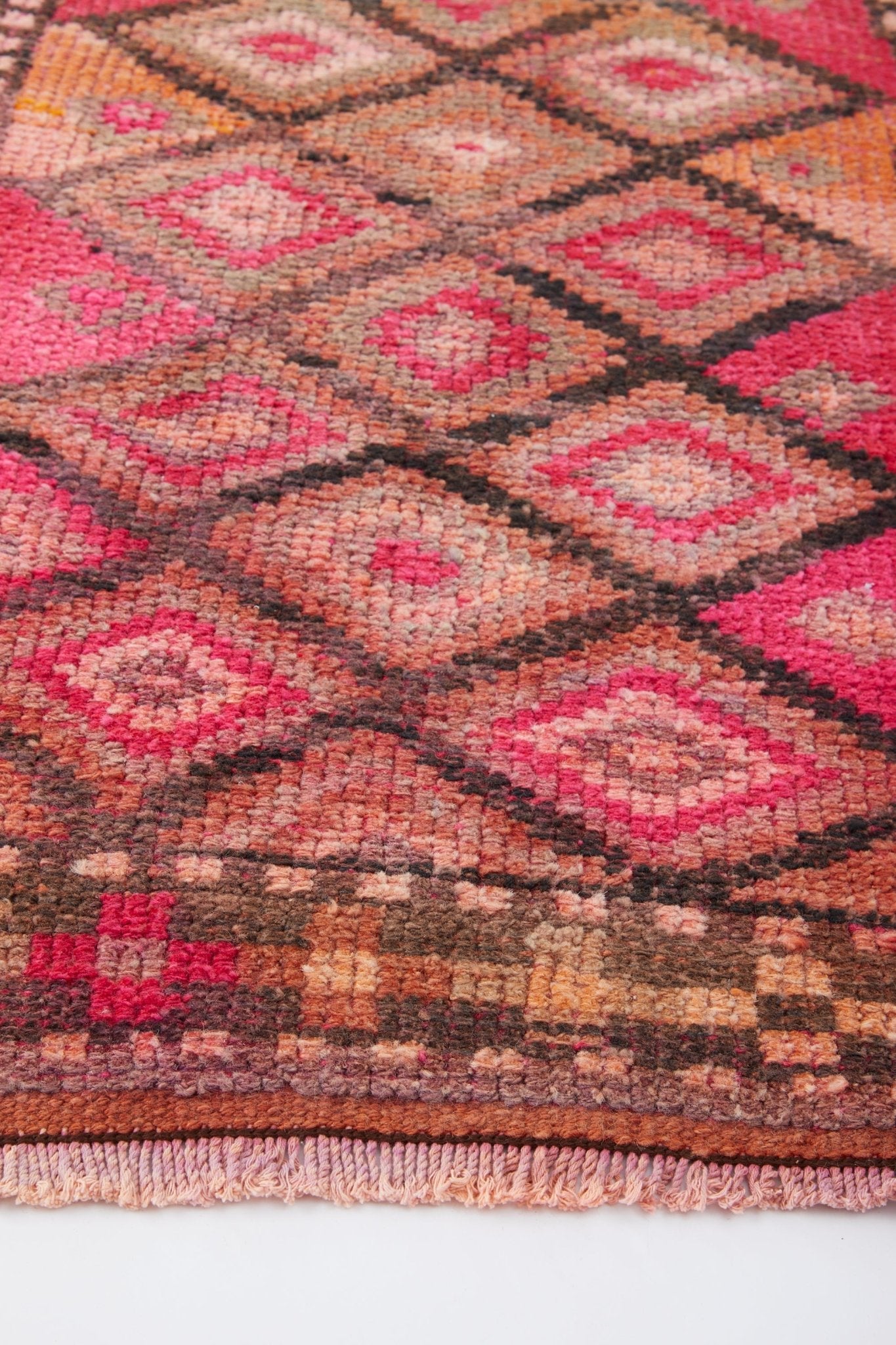 The 'Gemstone' vintage Turkish runner rug has a dynamic diamond pattern with a beautiful array of pink, coral, orange, and neon pops. This handwoven, antique runner is a unique piece of art for your floor and it's just the right size for a hallway, entryway and can also add a delightful pop of color to a kitchen!