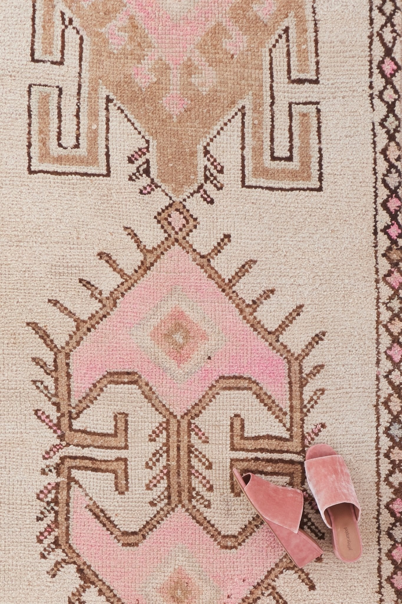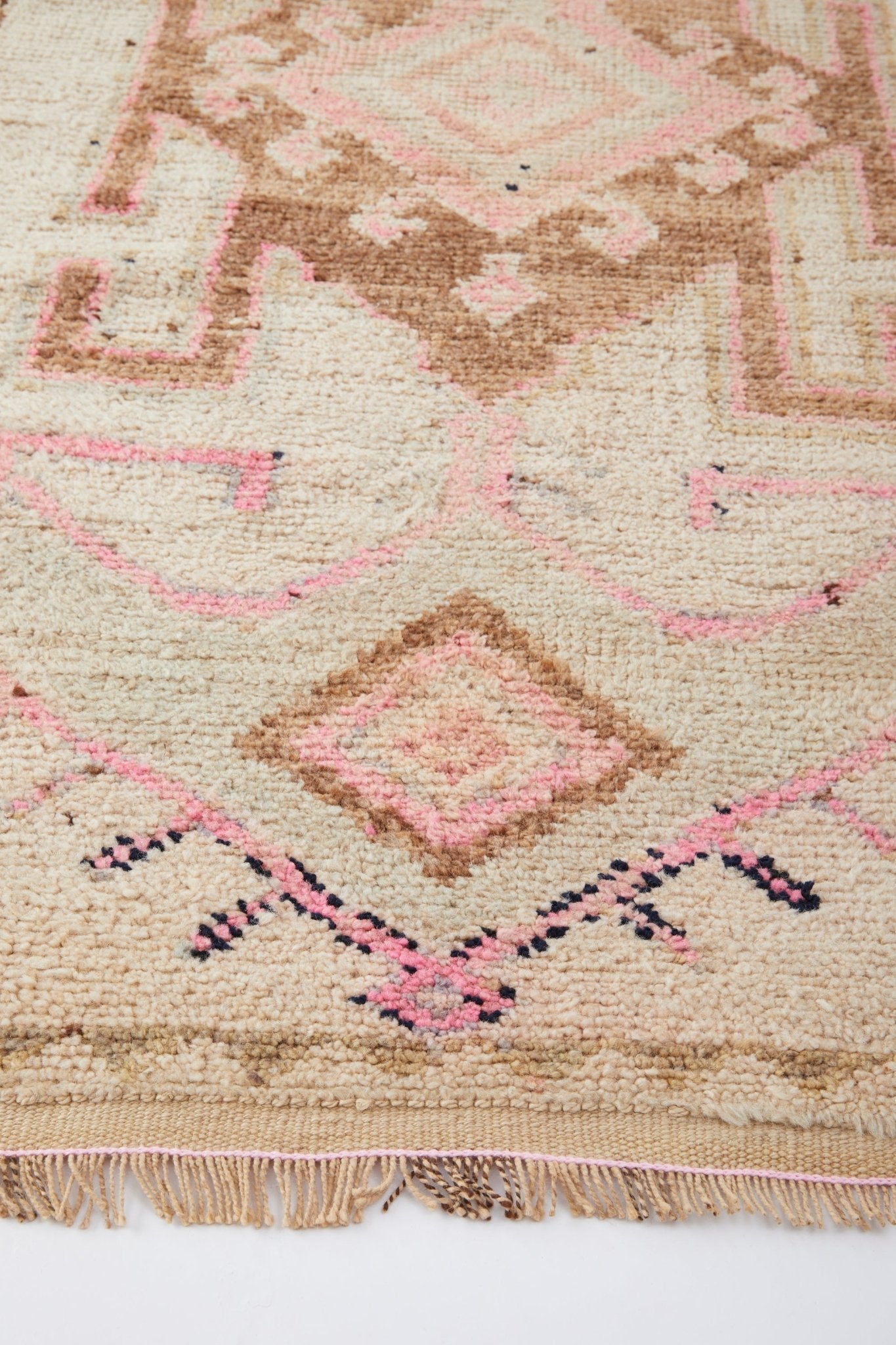 With dimensional shades of pastel blush and neutral hues, this beautiful handwoven, vintage runner is a piece of art. Its unique pattern and tiny details within the pattern are what make this piece extra special.